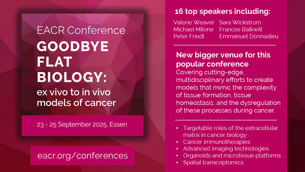 Join Goodbye Flat Biology in Essen, Germany (23-25 Sept 2025) for the opportunity to discover more about cancer models that span in vitro investigations to in vivo cancer biology: www.eacr.org/conference/goodbyeflatbiology2025 #CancerResearch #Oncology