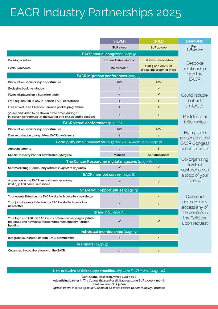 B EACR believes in the importance of partnership and collaboration and partners with assorted organisations through industry partnerships. Industry partners support the vital work of EACR in its fight against cancer and provide the means for EACR to develop.