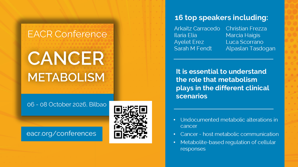 Join Cancer Metabolism in Bilbao, Spain (06-08 Oct 2026) for the opportunity to discover a detailed overview of the most recent advances in the field of cancer metabolism: www.eacr.org/conference/cancermetabolism2026